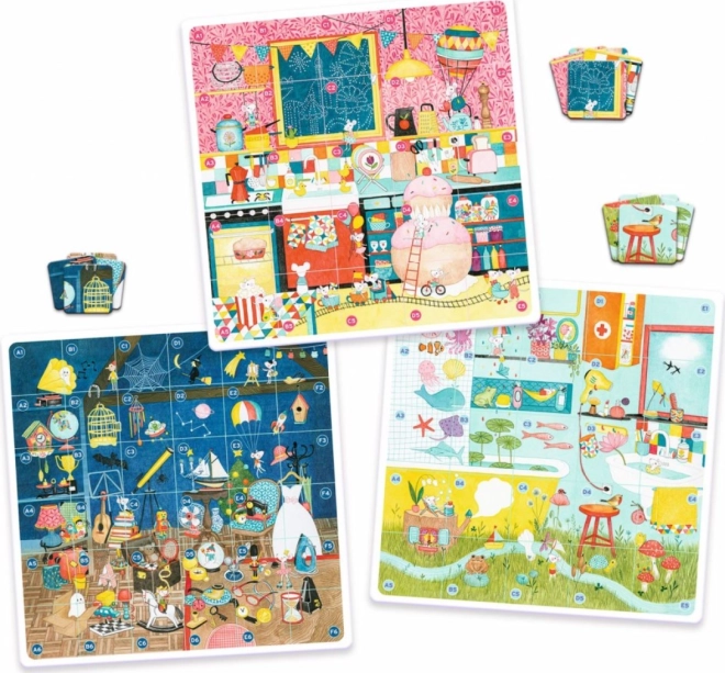 Spillet indeholder tre forskellige tematiske spilleplader: Badeværelse, Køkken og Loft. Hver af disse plader tilbyder forskellige sværhedsgrader, så I kan vælge efter spillernes sammensætning og deres færdigheder. Fortælleren viser sine evner ved at beskrive de små kort, så de andre kan finde den rette position på de store spilleplader.