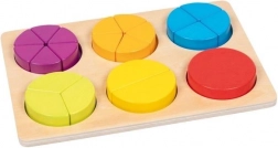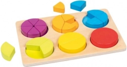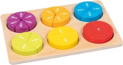 Det træbaserede læringspuzzle fra GOKI hjælper børn med at forstå matematiske begreber som brøker ved hjælp af farvede segmenter og udvikler logisk tænkning samt øje-hånd-koordination.
