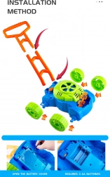 Inde i græsslåmaskinen arbejder en lille ventilator, der sender luft mod 8 roterende ringe. De dyppes skiftevis i væskebeholderen og sender bobler gennem dysen – så der skabes masser af bobler uden afbrydelser. De ledsagende boblelyde og eventyrmelodi forstærker glæden ved legen.