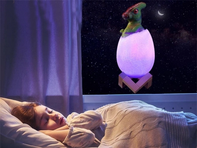 Denne stilfulde børnelampe kombinerer et legende design med praktisk stemningsbelysning. Dinosauren, der kigger ud af et sprækket æg på en elegant træbase, skaber en magisk stemning til både sengetid og hyggestunder. Skift nemt mellem 7 statiske farver og dynamiske RGB-effekter efter humør.
