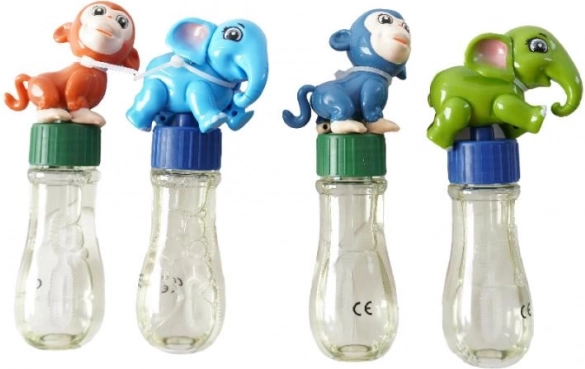 - Flaske med sæbeboblevæske og blæsepind, låg med dyrefigur