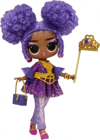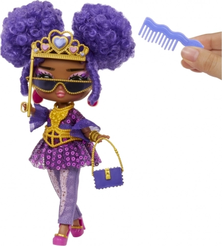 Cassie Cool imponerer med et glitrende outfit og markante lilla lokker. Sættet indeholder briller, håndtaske, krone og andre modeelementer til endeløse kombinationer.
