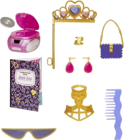 I pakken finder du en række overraskelser og tilbehør – fra krone og briller til håndtaske og kam – så børn kan matche dukkens look og udvikle fantasi og finmotorik.