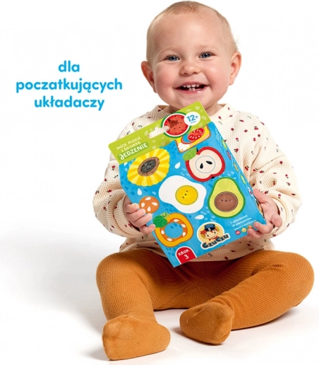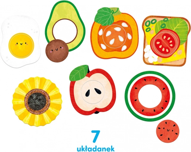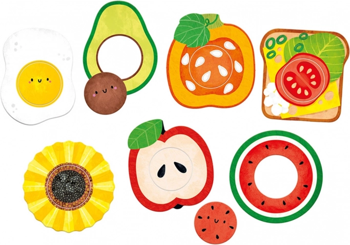 Det første puslespil til de allermindste, som dufter af sjov! Sættet indeholder 7 store todelte puslespil med temaet mad og udskiftelige cirkler. Takket være det enkle indsætningssystem er det intuitivt og motiverende at lægge. Understøtter finmotorik, vedvarende koncentration, opfattelse af former og farver samt en naturlig glæde ved at opdage.