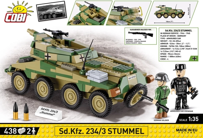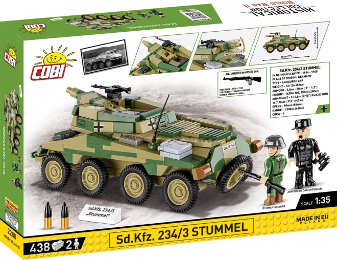 Modellen gengiver troværdigt Sd.Kfz. 234/3 “Stummel” med førsteklasses tryk uden klistermærker og proportioner, der matcher andre COBI-sæt.