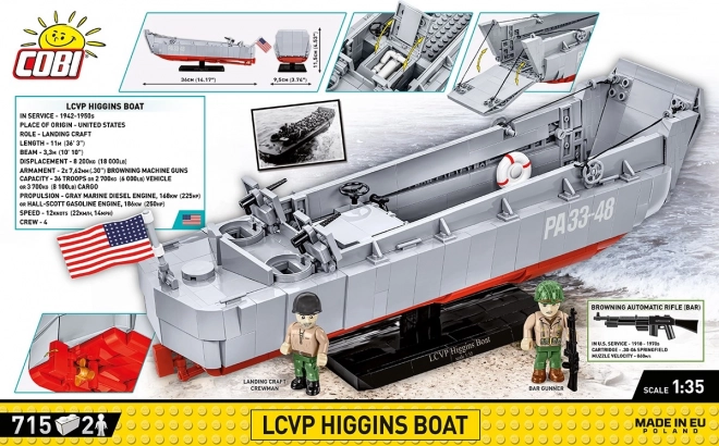 LCVP (Landing Craft, Vehicle, Personnel) designet af Andrew Higgins blev brugt i stor skala under operationerne D-Day, Torch, Husky, Shingle og Avalanche samt i kampene i Stillehavet. COBI-byggesættet er fuldt kompatibelt med andre byggemærker, opfylder sikkerhedsstandarder og leveres med en overskuelig vejledning.