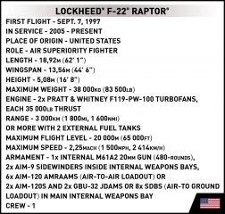 LOCKHEED F-22 Raptor er et højt avanceret jagerfly, der udmærker sig ved sin manøvredygtighed, stealth-egenskaber og evne til at håndtere både luft- og landoperationer. Denne model fra COBI skiller sig ud med sin detaljerede udførelse og er en del af Armed Forces-kollektionen.