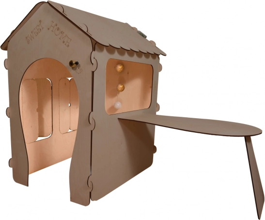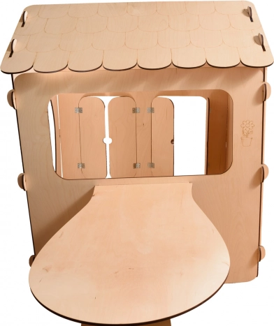 Huset har også et praktisk bord, hvor børn kan lege eller skabe. Det er lavet af træ med et naturligt udseende, hvilket giver et æstetisk og harmonisk look, der passer til enhver have eller indendørs plads.