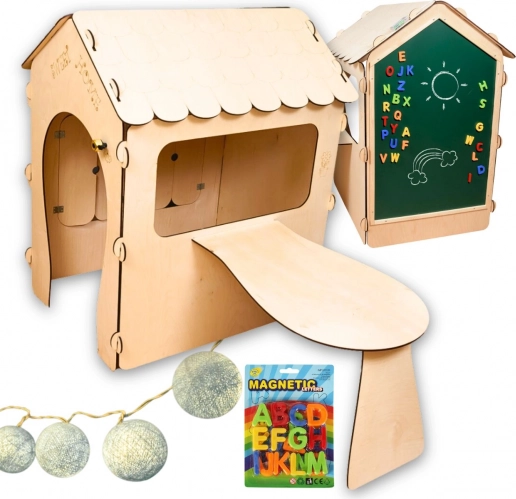 Børnelegehuset Sweet Home er det ideelle sted til kreative og lærende aktiviteter. Legehuset har en magnet- og kridttavle, som gør det muligt for børn at tegne og lære alfabetet ved hjælp af et sæt farvede magnetbogstaver.