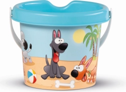 Farverig spand med motiv af en glad hundefigur, ideel til leg i sandkassen. Fremstillet i Italien af kvalitetsplast, hvilket sikrer sikre og sjove stunder for dit barn.
