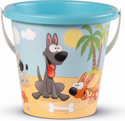 Mellemstort sandspand med motiv af en legesyg hund, fremstillet i Italien af kvalitetsplast. Perfekt til små byggere fra 10 måneders alder. Robust og let design gør den nem at bære.