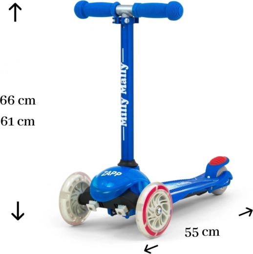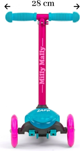 Børneløbehjulet Zapp Milly Mally er designet med fokus på børns behov. Takket være det aftagelige aluminiumsstyr er det usædvanligt let. Skridsikre håndtag med beskyttelseskapper beskytter den lille rejsendes hænder, og fodpladen, der er dækket af en speciel skridsikker belægning, sikrer bedre greb. Med disse funktioner vil barnet udvikle sig korrekt og hurtigt, samtidig med at det får masser af sjov.