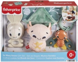 Gavesættet FISHER‑PRICE Sansernes Verden er et gennemtænkt udvalg af de første legetøj til babyer, der inviterer til udforskning gennem kontraster, forskellige teksturer og blide lyde. Hvert element er designet til sikker håndtering, lindring under tandfrembrud og støtte til tidlig sensorisk udvikling.