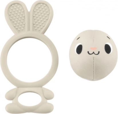 Silikonekanin med teksturerede ører og hul til sikker babygreb. Den aftagelige klokke-kugle motiverer til bevægelse og styrker finmotorikken.