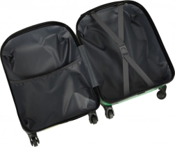 Indersiden er opdelt i to rum – ét med en netlomme og ét med krydsstropper for sikker fastgørelse af indholdet. Fire drejelige hjul og et udtrækkeligt håndtag gør det let for børn at trække kufferten.