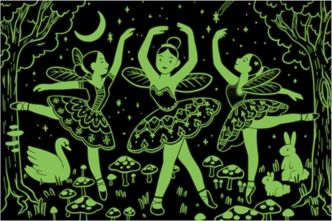 Saml den betagende dansescene direkte fra Svanesøen med et puslespil, der lyser i mørket! Indeholder 100 brikker med elegante dansere, der bliver til feer i en magisk lysning, når mørket falder på.