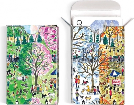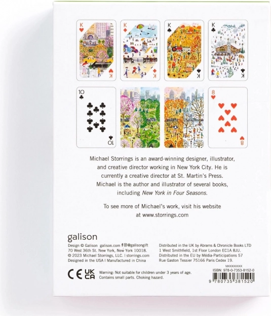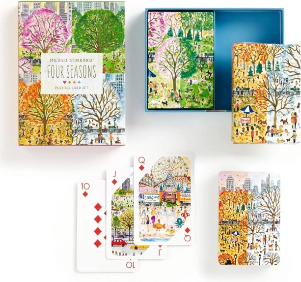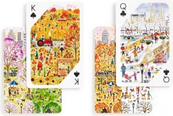 Dette designsæt bringer en unik atmosfære til dine spilleaftener. Hvert kortspil prydes af originale illustrationer af byscener og landskaber inspireret af forår, sommer, efterår og vinter. To komplette kortspil er placeret i en solid skuffeæske med magnetlukning for nem og sikker opbevaring.