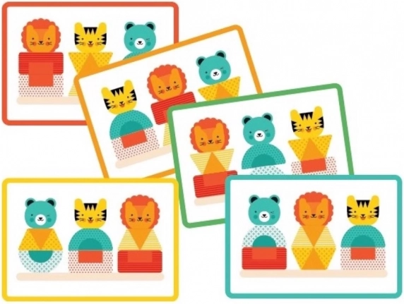 Hvert dyr er sammensat af geometriske former og giver børn mulighed for at bygge efter vejledning eller deres egen fantasi: