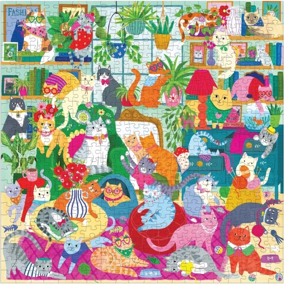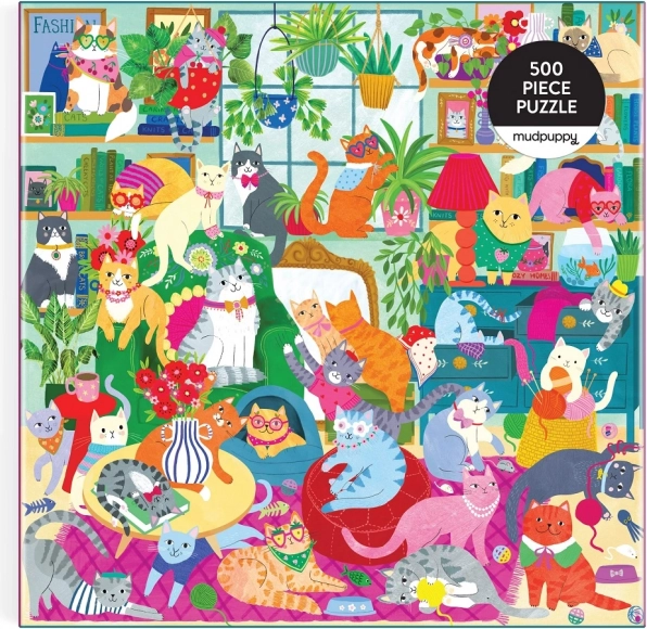 Puslespillet tilbyder en farverig illustration fuld af katte i forskellige farver og mønstre i en hyggelig hjemlig atmosfære.