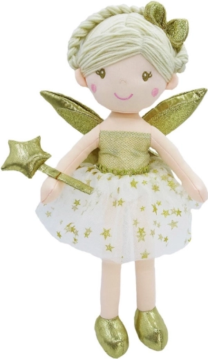 Den søde stofdukke i fe-stil er lavet af behageligt, blødt materiale og er perfekt som kæledukke og legekammerat. Hun har beige uldent hår i hestehale, broderede brune øjne og et kærligt smil. Hun er klædt i en glitrende gylden kjole med en hvid tylskørt, bærer gyldne vinger på ryggen og holder en glitrende tryllestav med stjerne i hånden. Omhyggelig udførelse og materialer af høj kvalitet sikrer lang holdbarhed. Uden lydeffekter.