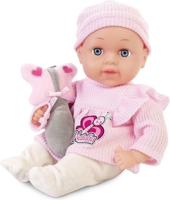 Dukke NATALIA baby 33 cm vil glæde alle små omsorgspersoner. Den bløde krop er lækker og sikker at kramme, så babydukken passer både til leg om dagen og til rolig indsovning. Der medfølger også et sødt legetøj, som stimulerer fantasien og understøtter finmotorikken.