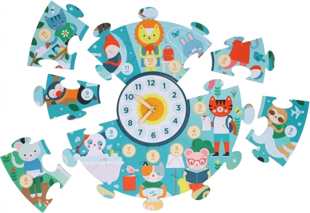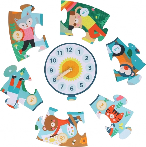 Midt i puslespillet er der en stor urskive med justerbare visere. Børn træner på en sjov måde at angive både timer og minutter og forbinder leg med praktisk læring.