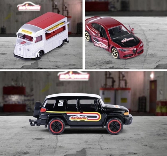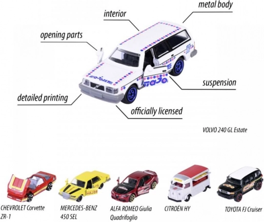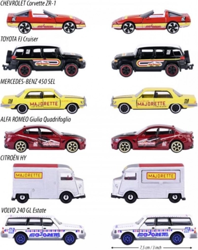 Hver model tilbyder åbnebare dele, affjedret ophæng og præcise plastforlygter for et endnu mere realistisk udseende. Tryk med Majorette-logo fra perioden fortæller brandets historie og glæder alle bilentusiaster.