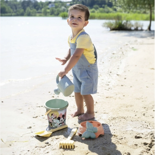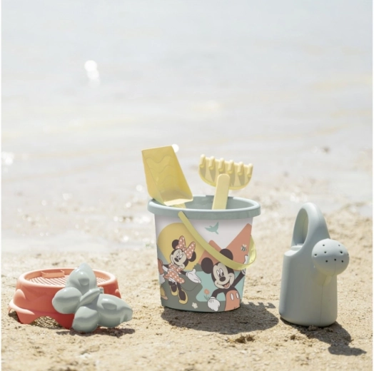 Sættet indeholder en spand med billede af Mickey Mouse, rive, skovl, sandform og vandkande. Der er anvendt genanvendt plast i produktionen. Fremstillet i Frankrig.