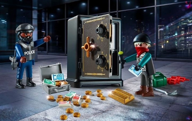 Det sjove startsæt PLAYMOBIL City Action bringer spændende action – indbrud i pengeskab. En tyv forsøger at åbne det godt sikrede pengeskab, men den skarpsindige betjent er lige i hælene på ham. Sættet omfatter et funktionelt pengeskab med drejeskiver og masser af tilbehør til realistisk leg.