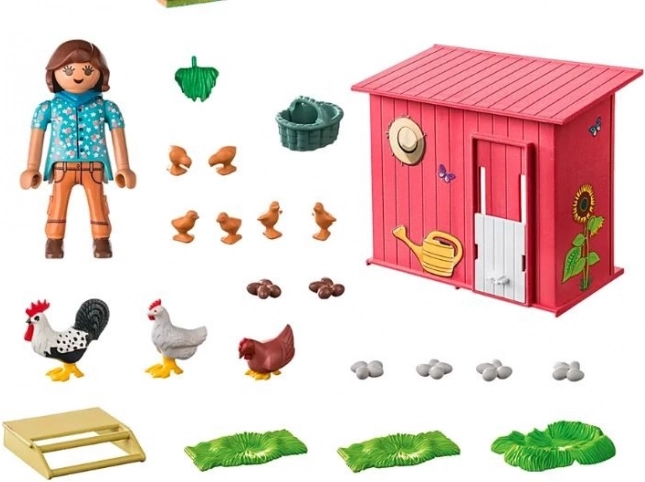 - PLAYMOBIL-figur, hønsehus, 2 høns, hane, 6 kyllinger, klistermærker og tilbehør