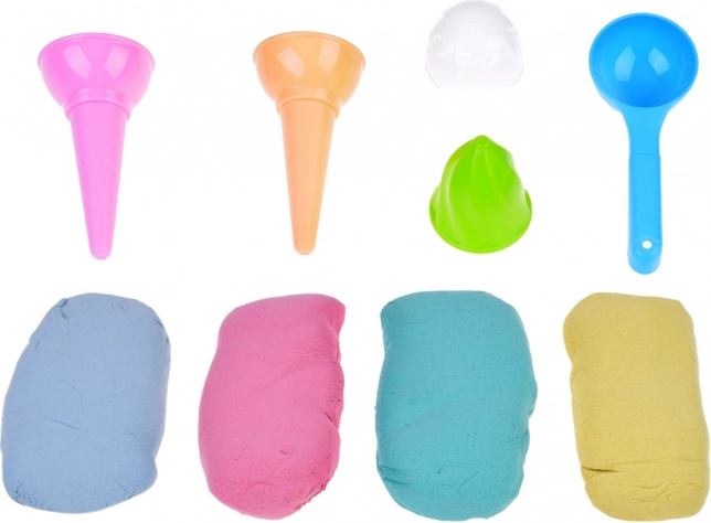 - I pakken: 4× 70 g sand (gult, lyserødt, grønt, blåt), 2 plastkræmmerhuse, 2 plastkugler, is-ske