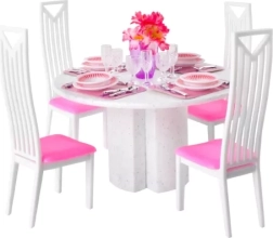 Dette gennemtænkte møbelsæt forvandler ethvert dukkehus til en hyggelig spisestue. Takket være realistiske detaljer – fra lyserøde dækkeservietter over tallerkener og bestik til glas – kan børn nyde mange timers fantasifuld leg og middage med dukkerne.