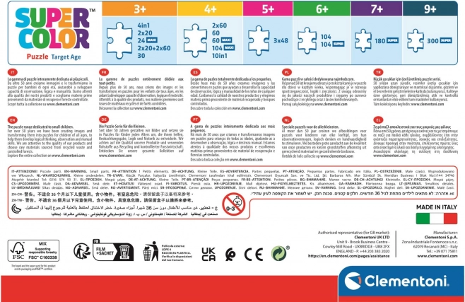 Progressivt puslespil med varierende sværhedsgrad – 4 puslespil med 12–24 brikker; efterhånden som antallet af brikker stiger, bliver brikkerne mindre. Puzzle SuperColor Collection – en serie designet specielt til børn, som hjælper dem med at udvikle finmotorik og iagttagelsesevne. Materialernes kvalitet og den eksklusive trykteknik sikrer vedvarende smukke, levende og strålende farver. Samlet puslespilsstørrelse ca. 19 × 14 cm