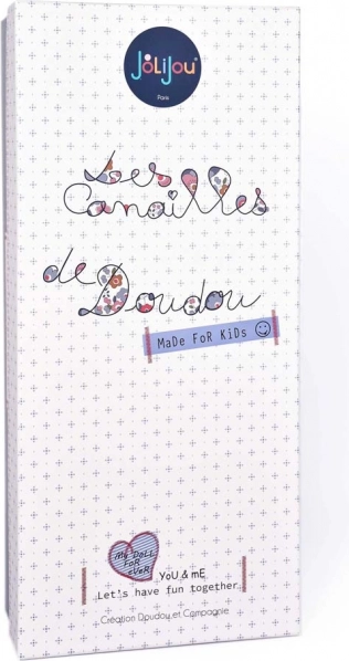 Blød tekstildukke Suzette 36 cm fra Doudou Jolijou. Sikker fra fødslen, broderede detaljer, aftageligt tøj, vask 30 °C, gaveæske.