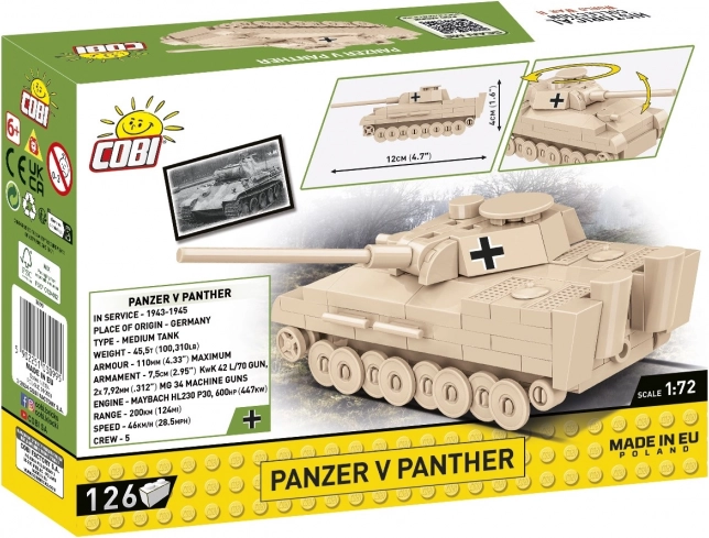 Mini-model af den legendariske kampvogn Panzer V Panther fra COBI i skala 1:72 med 126 klodser glæder både begyndere og samlere. Den byder på en drejelig tårn, bevægelig kanon og kvalitetsprint med historiske markeringer. Fremstillet i EU, fuldt kompatibel med andre mærker, med en tydelig billedvejledning.