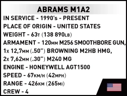 Med byggesættet COBI Abrams M1A2 skaber du en realistisk mini-model af en moderne hovedkampvogn. I skala 1:72 måler den færdige model cirka 14 cm og bevarer de karakteristiske linjer og autentiske markeringer fra forlægget.