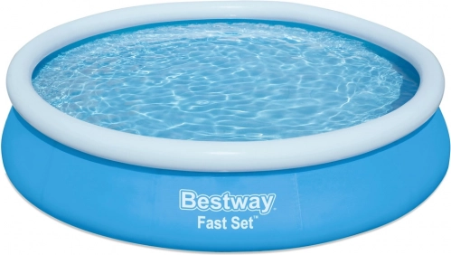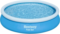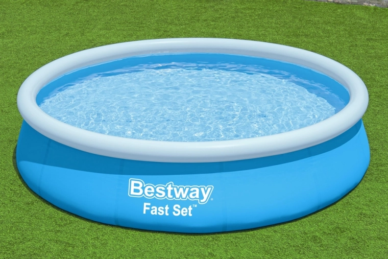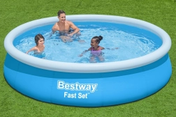 Den oppustelige fritstående pool BESTWAY Fast Set er det perfekte valg til hurtig afkøling i haven. Monteringen klares på få minutter – pust den øverste ring op, tænd for vandet, og væggene rejser sig af sig selv. Det stærke materiale med holdbar overfladebehandling tåler daglig familiesjov i vandet.