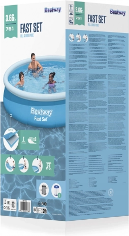 Nyd sommeren uden tidskrævende montering – den oppustelige pool BESTWAY Fast Set 366 × 76 cm skal blot pakkes ud, den øverste ring pustes op, og så fyldes den med vand. Takket være den selvbærende konstruktion er den stabil, sikker for børn, og med aftapningsventil med flowkontrol kan den nemt tømmes efter sæsonen. Det robuste materiale med punkteringssikker overfladebehandling sikrer lang levetid. Et filterpumpe med filter af type I er inkluderet.