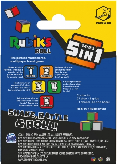 Rubiks Roll er et bærbart spil, der inkluderer 27 terninger, en ryster og to gittere. Dette dynamiske spil omfatter fem spil: Ryst, Enogtyve, Kampterninger, Trio og Terningsetårn, der kombinerer forskellige færdigheder såsom tælling og strategisk placering af terninger.