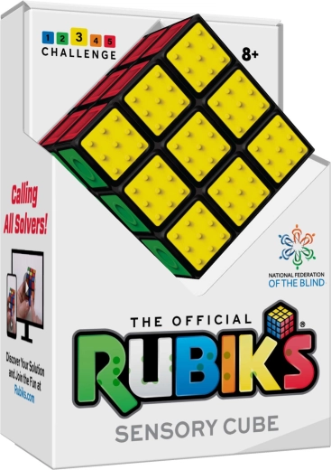 Rubiks terning 3x3 Rubik’s Sensory Cube bringer den legendariske puzzle i en tilgængelig udgave med reliefmønstre på hver farve. Teksturerne – prikker (gul), firkanter (rød), fulde cirkler (blå), ringe (grøn), kryds (orange) og glat (hvid) – gør det muligt at kende siderne på følesansen alene.