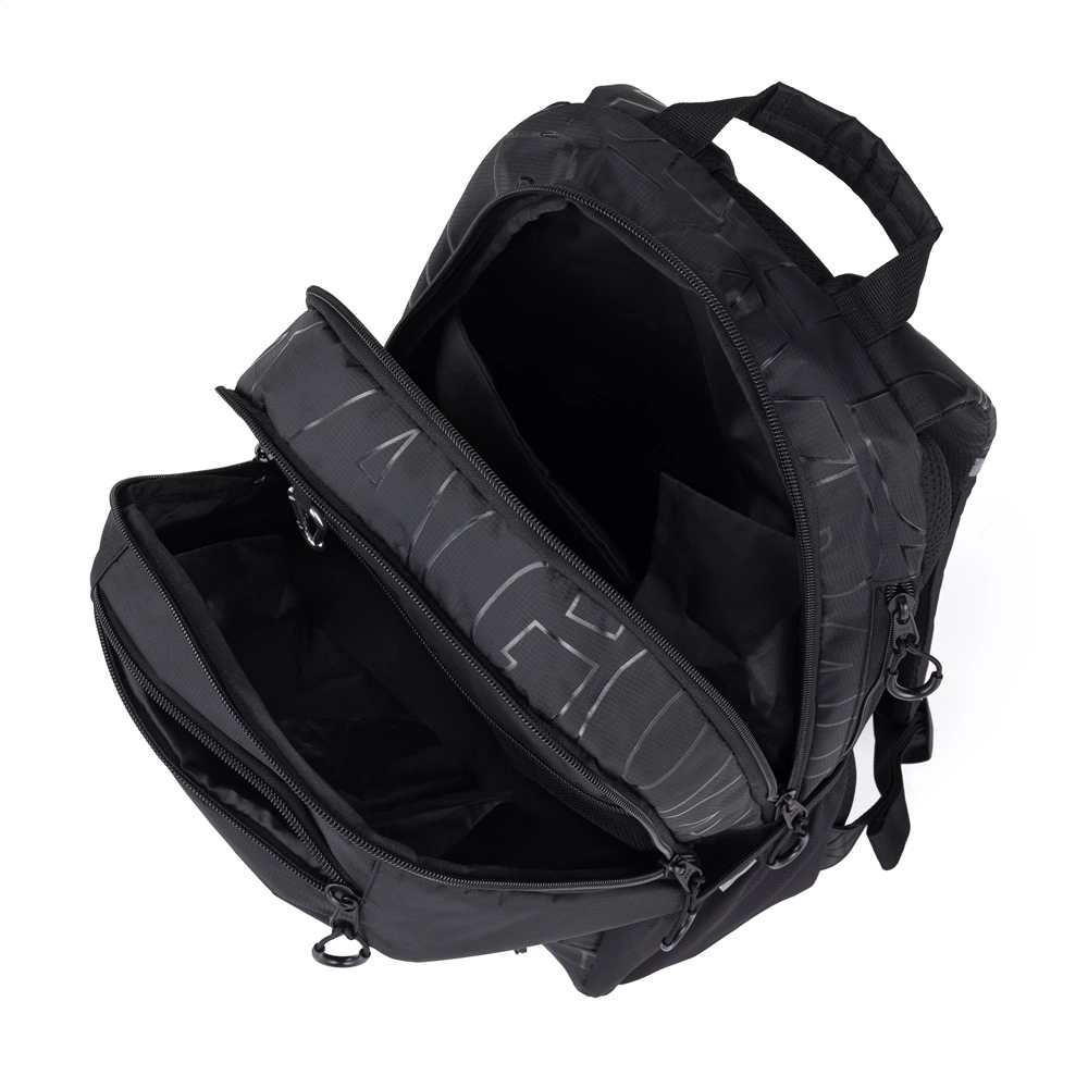 - 2 hovedrum, forlomme, forstærket lomme til bærbar, lomme til småting, karabinhage til nøgler, skjult lomme på ryggen, sidelomme til flaske