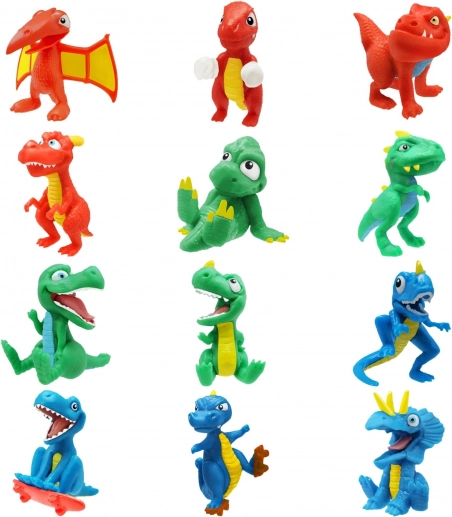 - 12 assorter – farverige slim-varianter og forskellige dinosaurfigurer.
