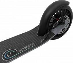 For sikkerhedens skyld er sparkcyklen udstyret med et dobbelt bremsesystem – en håndbetjent skivebremse bagtil og en fodbremse på skærmen. Trestegs højdejustering af styret (85–99 cm) tilpasser sig ryttere i forskellige højder, og ergonomiske gummihåndtag giver komfort selv på længere ture.
