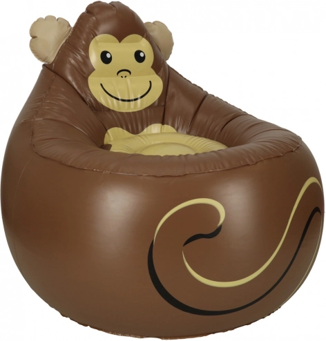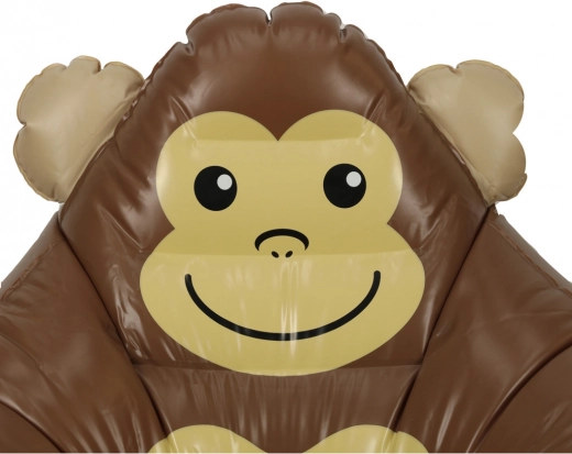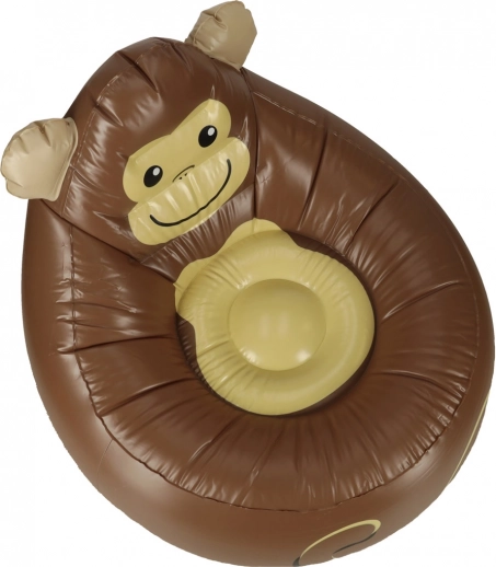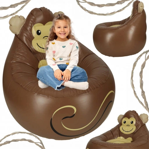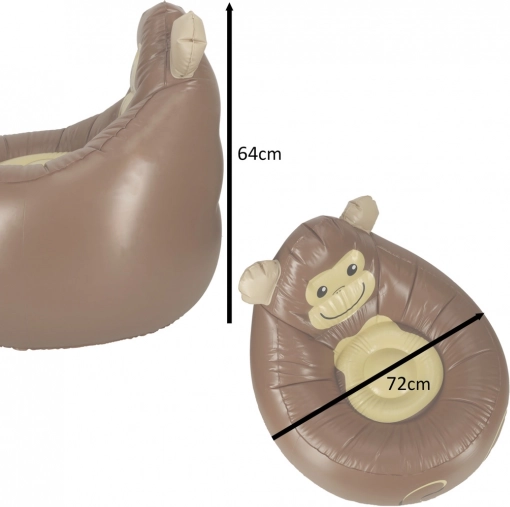 Sød oppustelig børnestol formet som en smilende abe bringer masser af glæde til både værelset og haven. Behagelig konstruktion af slidstærk PVC, kompakte mål og bæreevne op til 70 kg sikrer en tryg og behagelig siddeoplevelse for børn i forskellige aldre. Når den er tømt for luft, opbevares den nemt, og reparation er enkel takket være den medfølgende lappeseddel.
