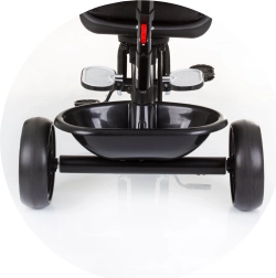 Sikkerheden kommer først: Trekantcyklen har en aftagelig beskyttelsesbøjle, sikkerhedsseler og en stabil konstruktion. Forældre vil sætte pris på det justerbare håndtag, de foldbare fodstøtter og praktiske kurve til småting for og bag. Når barnet er klar, kan bøjlen og håndtaget med kalechen fjernes, så den lille rytter kan træde i pedalerne selv.