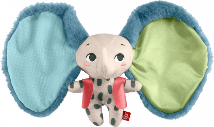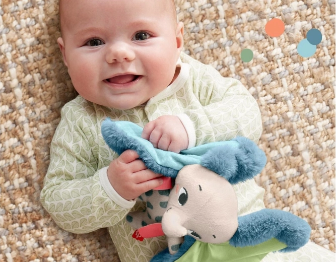 Den sensoriske, bløde legetøjselefant byder på rige taktile stimuli: blød plys, satindetaljer og knitreelementer. Kontrasterende nuancer af blå og grøn fanger opmærksomheden og støtter synsudviklingen, mens lette former at gribe om hjælper med at træne finmotorik og hånd‑øje‑koordination.