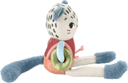 Kontrastelementer fanger blikket, forskellige stofoverflader udvikler berøringen, og knitrende dele i “skoene” stimulerer hørelsen. Lange ben, ører, stropper og en glidering indbyder til at gribe og træne finmotorikken.