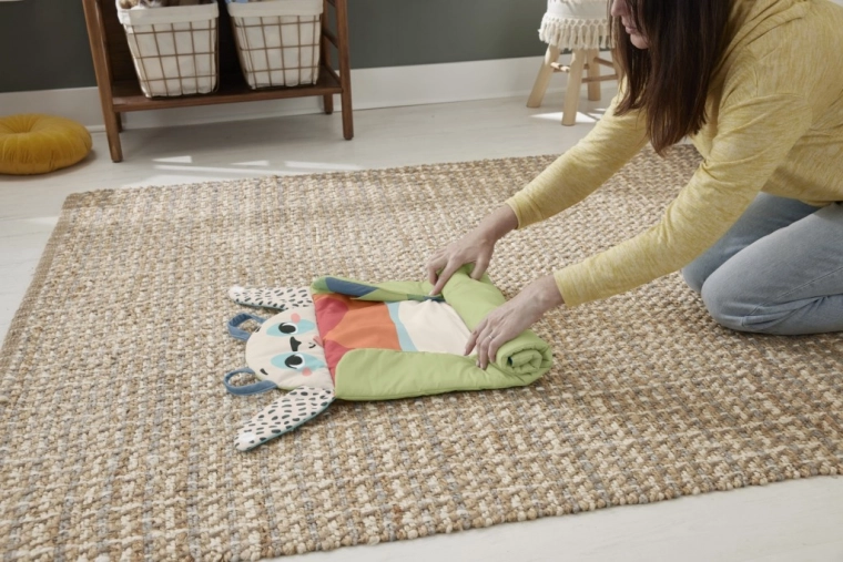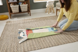 Underlaget er lavet af tekstil med 90 % genanvendt plast og leveres i FSC-certificeret emballage. Takket være den smarte løsning ruller du det nemt sammen, sikrer med “poter” og tager det med på farten. Det aftagelige legetøj fastgøres let i løkkerne, så legen altid er ny og inspirerende.