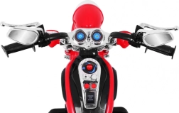 Motorcyklen er udstyret med belyst kontakt, LED-forlygte og audiopanel med 4 lydknapper. Tilslut musik via AUX og gør hver køretur endnu sjovere for børnene.
