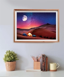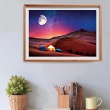 Udforsk et vidunderligt ørkenscenarie under en stjerneklar himmel med en fantastisk farveovergang fra blå til orange. Du kan ikke blot lægge det, men også nyde det som et kunstværk, der indbyder til eventyr. Målene på det færdige puslespil er 49 x 36 cm, hvilket er ideelt til dit arbejds- eller opholdsrum.